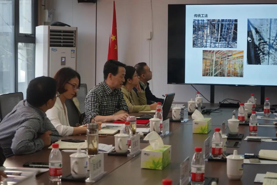 會前,大家參觀了基地內(nèi)各條生產(chǎn)線、構(gòu)件展示區(qū)和吊裝現(xiàn)場,了解了構(gòu)件生產(chǎn)工藝、工藝布置、設(shè)備運行情況和裝配式建筑吊裝的要點與難點。為加深大家對裝配式混凝土的了解,趙教授還與技術(shù)人員就PC生產(chǎn)的工藝流程及關(guān)鍵工序等進行了探討交流,并對基地下一步發(fā)展運營提出了寶貴的意見與建議。