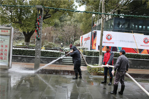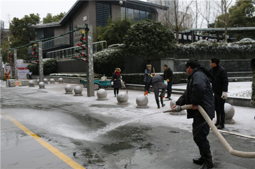 23日的凌晨整個湖州城積雪加上冰凍,仿佛進入了“慢鏡頭”模式,緩緩地開車,小心翼翼地行走。愛山廣場步行街區也被這白茫茫的一片籠罩著,雖然只是薄薄的一層,可耐不住冰凍呀!看到這樣的情況,物業服務中心的領導和員工們第一時間行動起來打響了道路暢通“保衛戰”。在潘文哲、邢燕的帶領指揮下我們分成了3個組,把愛山廣場步行街內主干道路段:人民路、紅線范圍內公園路,志成路(北起20#車庫口南至紅旗路口),同岑路(東起人民路口西至星火7#樓北側)進行包干。一大早,大伙兒就在各自的“包干區”里忙活起來。除雪、鏟冰、使用高壓水槍沖刷地面是個體力活,所以盡管室外白雪皚皚、寒風刺骨,可是不少員工們的額頭上還是冒出了汗珠,直到早上十點鐘多,終于把三條主干道的積雪及薄冰鏟除干凈,大伙懸著的心放下了。