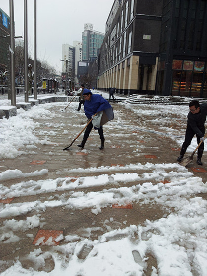 年前下了兩場大雪,愛山廣場路面積雪給通行帶來了極大的不便,也影響了周邊店鋪正常營業。公司團委兩次組織青年團員掃雪鏟冰。大家冒著風雪,不顧嚴寒迅速開動,趕在路面凍結以前將積雪清除,現場呈現出一派熱火朝天的景象。在幾個小時的共同努力下,愛山廣場的一些主要路面得到了清掃,保障了車輛順利通行,方便了行人安全出行,同時也為商業街區的正常營業提供了良好的環境。